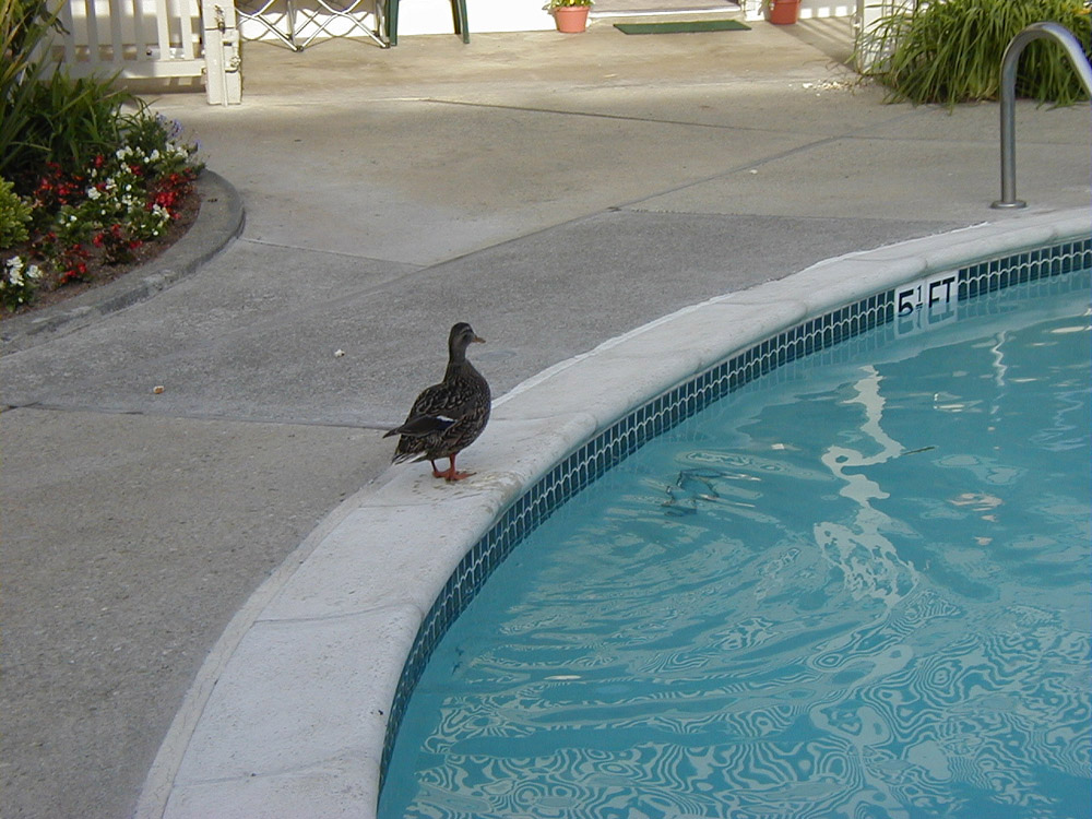 that is not exactly welcome! There have been several ducks. Believe it or not, the environmentalists come down on the apartment complex for trying to move the ducks out of the pools and complex area. If the complex doesn't move the ducks, the health department comes down on the apartment complex for allowing ducks to dirty the pool! Talk about your Catch-22!!!