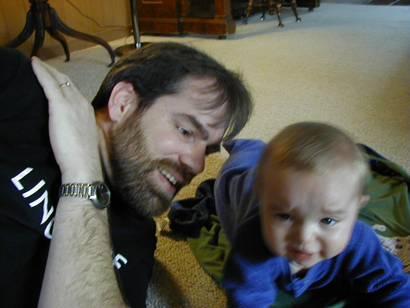 He loves to play peek-a-boo games and talk silly with you and, Uncle Brian taught him something new: hands clapping!  Well, actually, Brian clapped his hands and if Rob was crying or doing anything else, he would stop and just stare in amazement.  Now, part of this theory also has to go to the fact that if you were Robert, you've got "this guy" looking at you, and you're under 6 months old and you've gotta be thinking:  "He's related to me??"