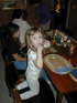 All afternoon, Dani kept asking us when she was going to get to open her present or she would ask what her present was-- we both just said we didn't know when she would get to open presents and wouldn't tell her what we'd gotten for her.  This would reoccur about every half hour but finally, it was time!!  Alex loves to play with the bows from gifts (and to help you open them, to be honest!) but she loves to lick icing more!  Even as tricky as she can be, she still got caught by Uncle Brian in this picture!  (Apparently, this is something that she picked up at our wedding, according to what her mother told me tonight-- she took a big swipe at our wedding cake!)