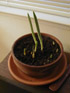 The tulips have, apparently, decided to go left-- we've got bunny ears and, I believe that our count on the whole pot is up to 9 total shoots started.  I've got a feel that the empty spot in the upper left "corner" (behind the bunny ears) of the pot isn't really empty but . . . we'll have to see!