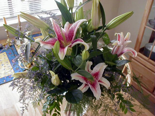 A little while later, one of the maintenance sales reps was in my office and we were talking.  He and I both heard a commotion in the hallway-- Heather, one of the administrators was having to tell people to back-off-- "They're for Marcia!"  Huh??  What was for Marcia?  The maintenance sales rep looked at me and started grinning, "I believe you have flowers arriving!" and sure enough, there was a huge bouquet of the most beautiful Stargazer Lilies!!