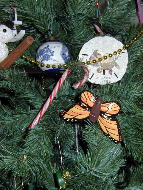 This is an interesting grouping: A sand dollar from Monterey (I have one from Cayucos, as well!), a delft ornament from Holland (Michigan) and a butterfly from Natural Bridges State Park.