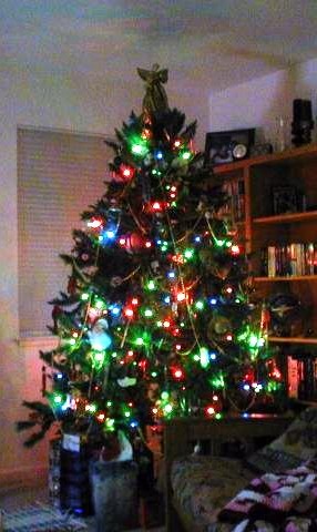 Last but not least, a picture of our Christmas tree, lit at night . . . lovely, eh?