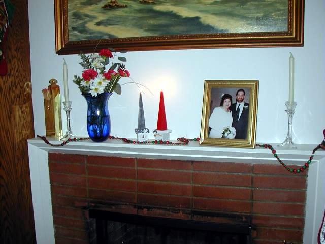 On December 1, 2001, I put up our Christmas tree and began the fun of decorating our house.  This is the first year that we've had a house to decorate but, since we were working with essentially the same furniture, there weren't many changes there.  One problem I discovered is that our mantel is built in an odd, stocking-unfriendly manner!!  As a result, our stockings are hung in a not-so-decorative manner however, they won't be missed by The Big Guy when he comes down the chimney!!