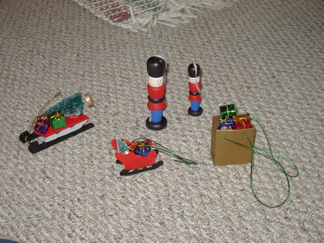 This year, I hand-painted two different sizes of soldiers and had three different sizes/types of sleds; also pictured is a "Shopper's Ornament"