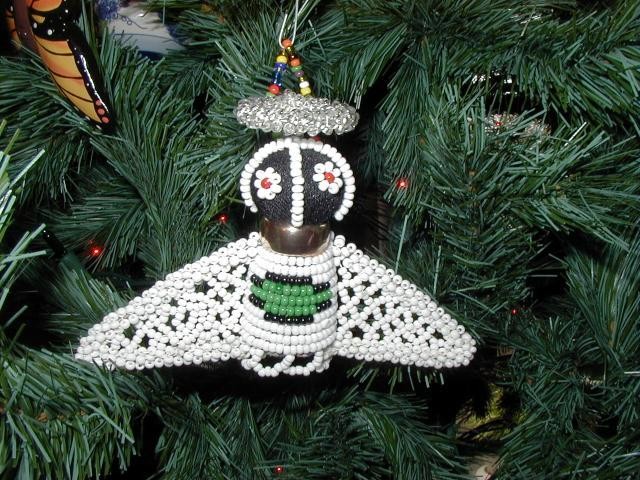 This is an angel from South Africa.  The South Africans believe that if you have a perfect ornament, evil will stay with it.  As a result, there's an imperfection in everything they make-- in this angel, there's a bead in the wrong size that let's the evil out!