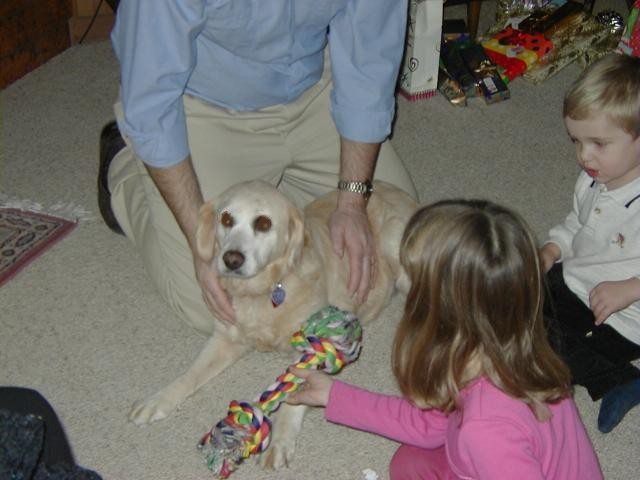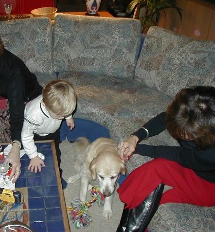 Last year, Brian gave me some goofy-looking plush slippers with little dog paw prints on them and, very seriously, promised me a dog of my own by Christmas this year.  Well, instead of a dog of my own this year, we have a dog of our own!!  Sally joined us today, December 9, 2001.  Of course, she's a little confused about where she belongs these days but we'll all get used to each other and live out our days ever so happily together.