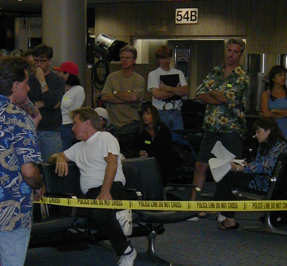 When we got nearer to our next gate (58), we noticed that Gate 54B was roped off with Police tape ("POLICE LINE DO NOT CROSS") and the first thought for me was "Oh, great, someone got shot!" No, this was not a good thing-- I had hoped that the airport would be immune from such activity. As it turns out, it was immune (at least for this incident) since it was, in fact, the location chosen by the crew of "West Wing" to tape an episode. From the looks of it, we thought the work was done and the crews that were standing around (See, its not just CalTrans!) were waiting to haul off the equipment in one fell swoop. Not so, apparently! After about a half hour, a couple moved over to the seats in front of us complaining that the crew told them they had to move; they were going to start shooting and needed the non-extra extras (read: non-union) to move out of the way. That's when we found out that it was the West Wing that was being shot there and that they weren't finished. At the time, I remarked to Brian that I thought that was the television show that Martin Sheen was working these days. Brian thought that he played "President Bartlett" so we wouldn't see him since anyone portraying the President of these United States doesn't use the terminals at airports. As I told Brian, "If I can't see Martin Sheen, I don't care what they do over there" and I settled back down to continue reading my book ("White Oleander").