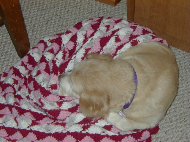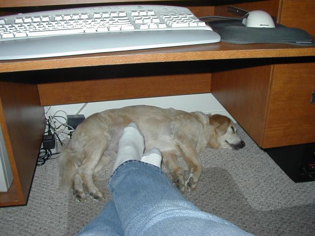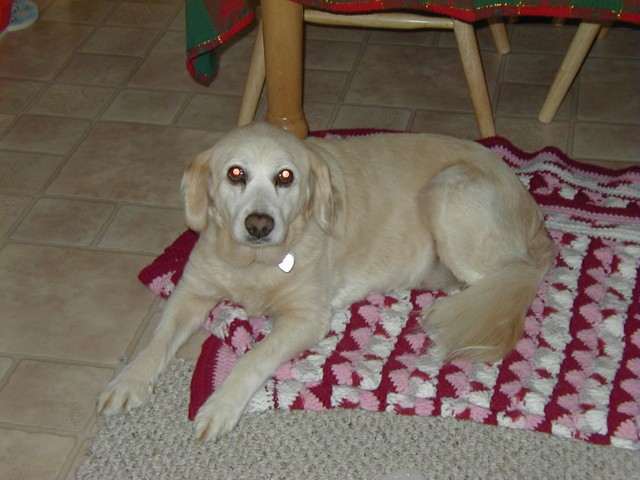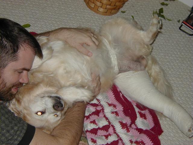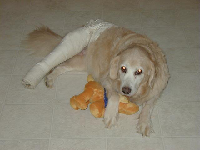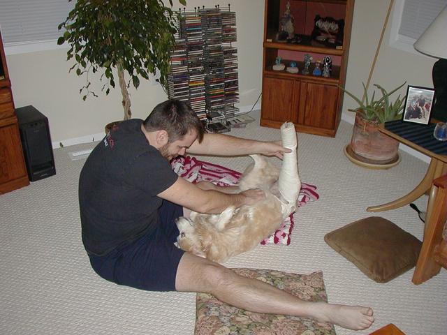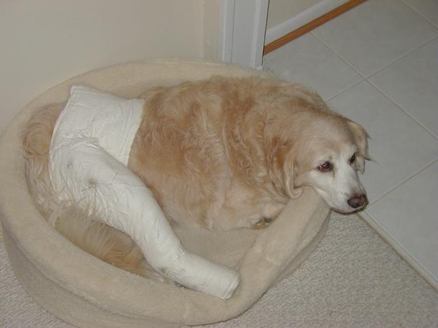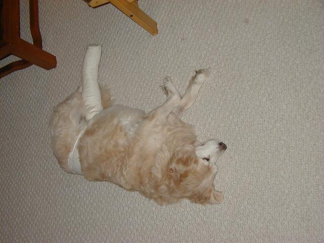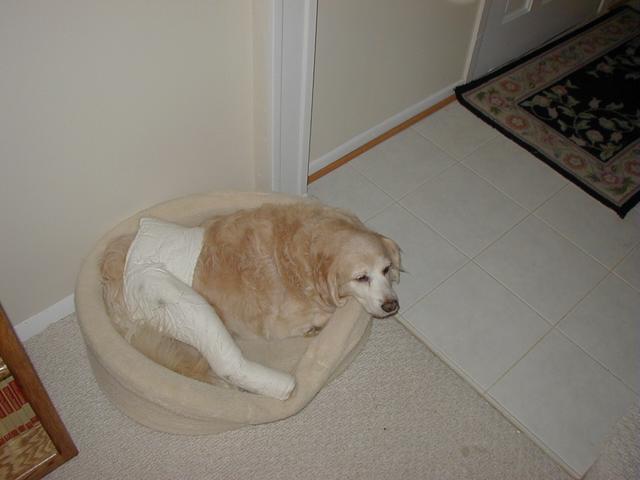 If you've been to my site recently, you know what's been happening. Poor Sally got a little too frisky for her own good and over-extended her right knee causing a tear in the cranial cruciate ligament. That was on Tuesday (10/8) and on Wednesday, October 9, she had surgery. Today, Sally came home but she is definitely not a happy puppy. Our poor Baby Girl is just beside herself with unhappiness and moping about her dillema. I can't say as I blame her-- I remember what it was like for me, not too long ago!